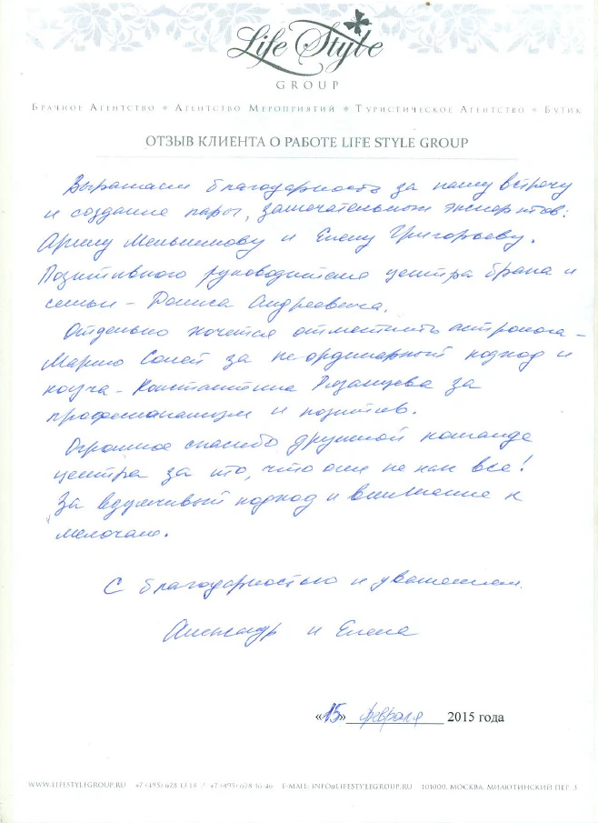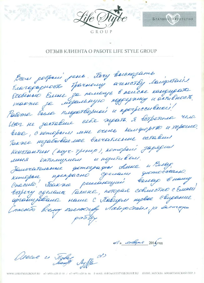 Life Style Group – современная компания свадебной индустрии, отличающаяся от существующих служб знакомств и брачных агентств, собственными эффективными методиками и технологиями, созданными на основе российского и международного опыта в области семейной психологии и коучинга, детальным анализом запросов каждого Клиента и современного рынка услуг, регулярным контролем качества и динамичностью, а также строгой приверженностью к высокими стандартам сервиса, которые позволяют нам быть впереди и превосходить ожидания Клиентов!
